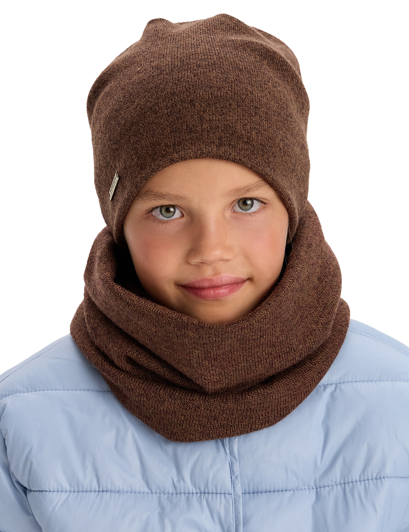 Комплект шапка и снуд из 100% шерсти мериносов для девочек, цвет коричневый меланж