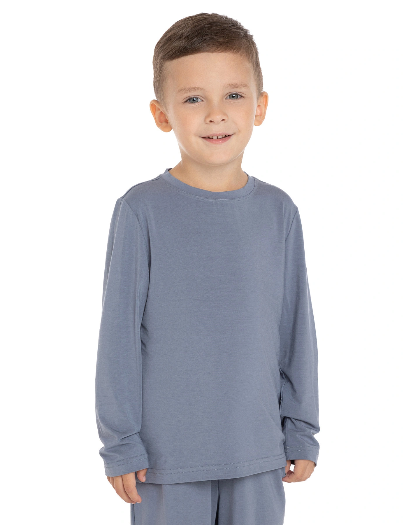 Детская одежда Bamboo создана для комфортного ношения и здорового сна в течение всего года. Футболка классического фасона с длинным рукавом хорошо садится по фигуре и не сковывает движений. По краю горловины предусмотрена эластичная резинка для лучшего прилегания. Все швы мягкие, информация об изделии нанесена на изнаночной стороне спинки в виде не ощутимого кожей принта. Оптимальная длина до линии бедра позволяет носить футболку как навыпуск, так и в заправленном виде. В сочетании со штанами из этой же серии получается привлекательный и удобный пижамный комплект в сером, голубом или черном цвете, который можно носить как домашнюю одежду.
