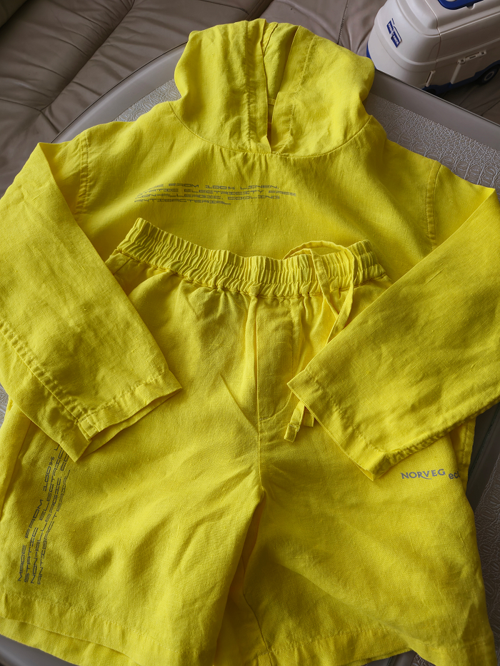 У нас комплект, оранжевые шорты и худи. Очень клевый костюм, яркий, как апельсин!!! Обожаем его, стирается прекрасно. Не красится, не выцветает. Лен прекрасного качества! Носили все лето, очень довольны. Крой хороший, ребенку удобно!