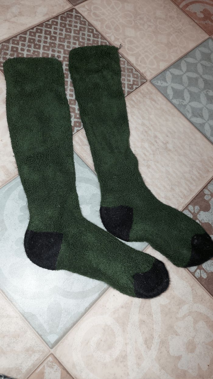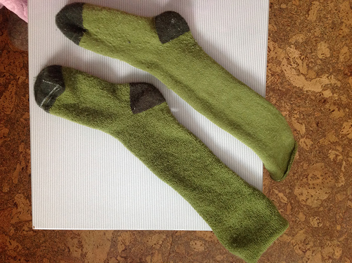 Зеленые год назад приобретены. Ношены активно (не с резиновыми) с зимними сапогами махровой стороной внутрь. Только сейчас заметила, что махровая сторона на фото магазина - лицевая. Не знаю какая цель преследуется этим... Тянется носок хорошо, размер 35 легко растягивается до 38 го. Нежный, теплый, пятка не протерлась. Носок при хотьбе в обуви не съезжает вниз. На фото вид после сезона эксплуатации.
