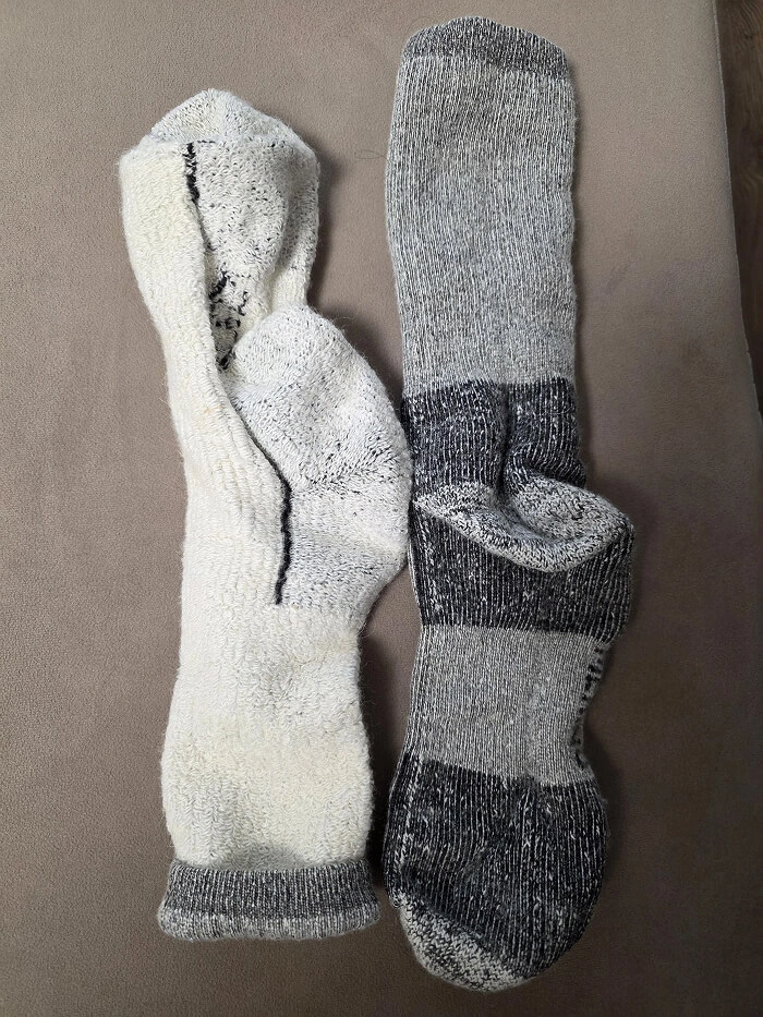 Эти носки выше остальных, что я брала. И у них очень плотная вязка. Плюс дополнительно видно части, где более плотная фиксация. Очень понравилась защита пятки с усиленными вставками - очень хорошо помогает от натираний и излишнего давления обуви. Нужно учитывать, что не смотря на плотную вязку, носки прибавляют объёма, поэтому если обувь узкая и впритык, то будет ноги конечно давить. Очень хорошие носки, качественные, не покрываются катышками. Ногам комфортно и нет излишней потливости, что говорит о высоких терморегуляционных свойствах.