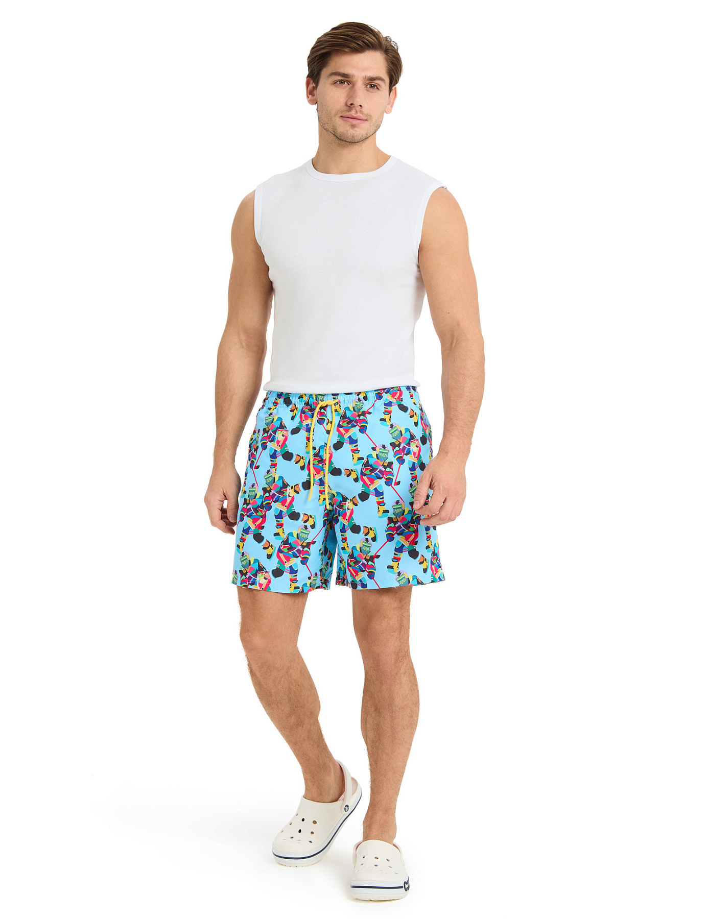 Практичные мужские шорты для плавания с оригинальным фирменным принтом. Универсальная модель для пляжного отдыха, бассейна, акваспорта.