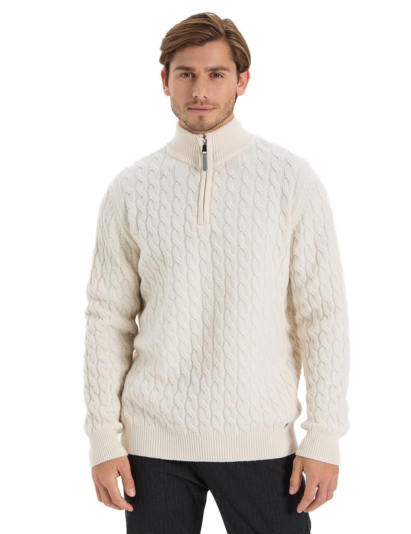 Шерстяной джемпер базового цвета – незаменимая вещь в холодный период года. Изделие свободного кроя хорошо садится по фигуре, без обтягивания. Высокая горловина на молнии защищает область шеи от продувания и позволяет регулировать степень утепления. Широкие, эластичные манжеты и резинка снизу джемпера мягко облегают, минимизируют потери тепла. Рельефный узор придает изделию привлекательность. Объемная вязка обеспечивает максимально эффективное сохранение тепла. Классический джемпер идеально дополнит повседневный и офисный гардероб.
