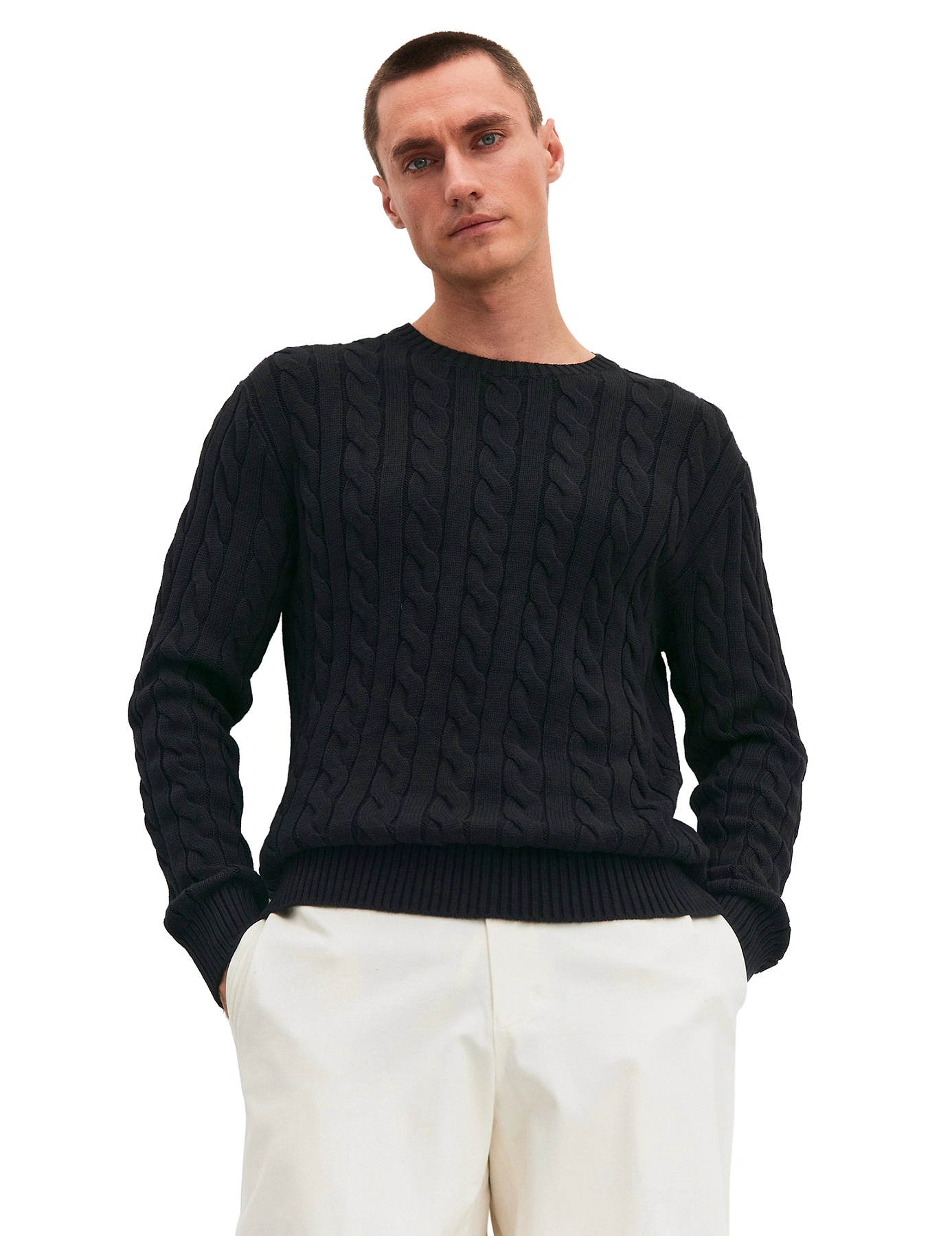 Стильный джемпер базового цвета – незаменимая вещь в мужском гардеробе. Изделие свободного кроя хорошо садится по фигуре, без обтягивания. Круглая горловина позволяет носить джемпер с рубашками и создавать классические образы. Широкие, эластичные манжеты и резинка снизу джемпера мягко облегают, минимизируют потери тепла. Рельефный узор придает изделию привлекательность. Объемная вязка обеспечивает максимальный комфорт и эффективное сохранение тепла. Классический джемпер в базовых цветах: графитовый, черный и темно-синий идеально дополнит повседневный и офисный гардероб.