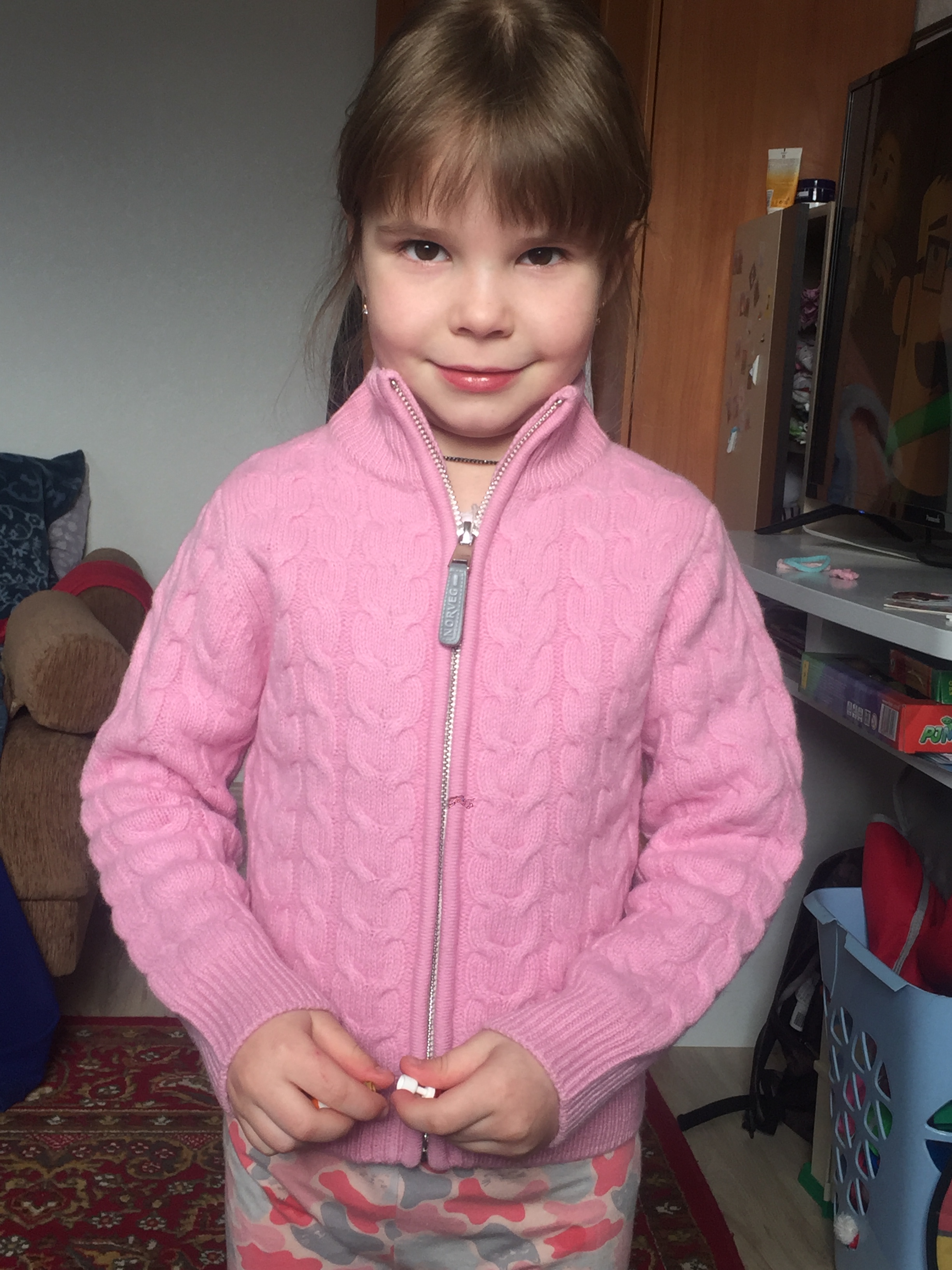 Великопный кардиган - мягкий, теплый, уютный. Взяли дочке в школу, но носит вообще не снимая, и в магазин, и в кружок. На рост 122см, взяли размер 128-134, есть хороший запас.