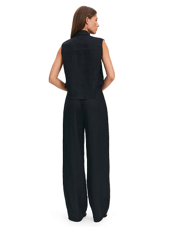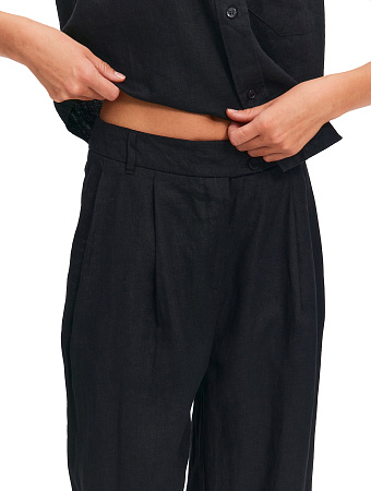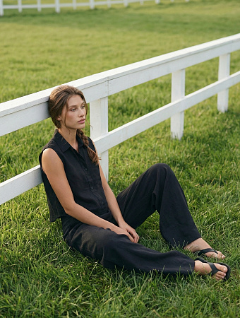 Женские брюки LINEN — эталон лаконичности: прямой силуэт и благородная фактура умягченного льна создают образ, неподвластный времени. Они идеально садятся по фигуре и не сковывают движений. Особое внимание уделено деталям, определяющим комфорт. Пояс сочетает застежку на молнию с пуговицей спереди и мягкую резинку сзади, что гарантирует безупречную фиксацию и удобство в носке. Вместительные боковые карманы добавляют модели функциональности. Швы с закрытым срезом обеспечивают эстетичный вид изделия и максимальный комфорт при соприкосновении с кожей. Брюки прекрасно комбинируются с рубашками, жилетами, топами и блузами из серии LINEN, помогая сформировать гармоничный монохромный образ, уместный и в городской среде, и в атмосфере летнего путешествия. Цветовая палитра включает глубокие базовые тона: графичный черный и строгий темно-синий. А также авторские флористические принты: энергичный Tropical Flowers и утонченный Wild Flowers на фоне мягкого шалфея.