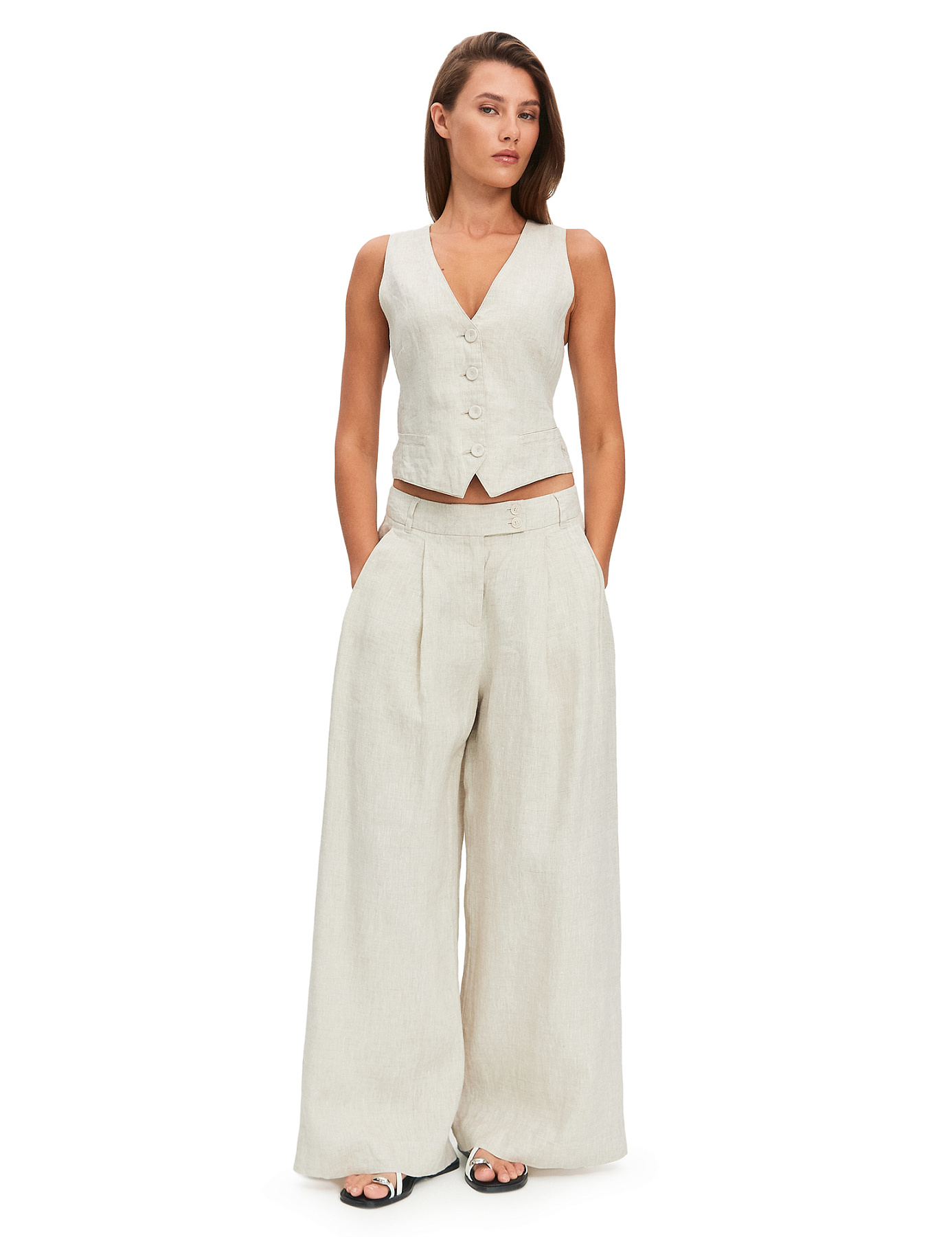 Брюки палаццо LINEN олицетворяют эстетику тихой роскоши, где свободный крой и безупречное качество ткани говорят сами за себя. Летящий силуэт в сочетании с классическим прямым фасоном создает эффектный образ, визуально вытягивающий фигуру и дарящий ощущение невесомости. Продуманные детали подчеркивают премиальный статус модели: широкий пояс с петлями для ремня дополнен надежной застежкой на молнию и две пуговицы, обеспечивая безукоризненную посадку. Вместительные боковые карманы добавляют практичности, а швы с закрытым срезом гарантируют комфорт и долговечность. Брюки гармонично сочетаются с рубашками, топами и жилетами серии LINEN, что дает возможность создавать как строгие офисные сеты, так и элегантные наряды для путешествий или вечерних выходов. Модель представлена в аристократичном бежевом меланже и классическом исполнении в тонкую белую полоску на сером или джинсовом фоне — такие решения подчеркивают рельефность льна и смотрятся по-настоящему эффектно.