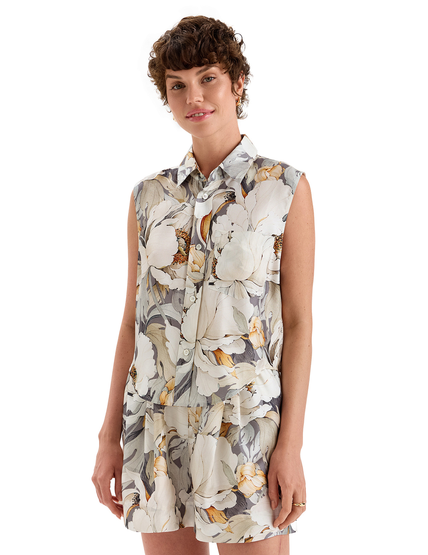 Блуза SILK женская без рукавов, цвет паттерн peonies
