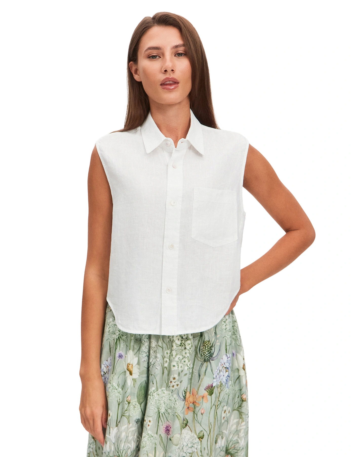 Блуза без рукавов LINEN — квинтэссенция легкости и элегантности для вашего стильного лета. Лаконичный прямой крой в сочетании с классическим отложным воротником создает утонченный образ, который будет одинаково уместен в строгом офисном сете, расслабленном наряде для прогулки по побережью или изысканном вечернем выходе. Скругленный низ визуально вытягивает силуэт и предоставляет вариативность носки. Продуманные детали — функциональный нагрудный карман и качественные швы с закрытым срезом — придают практичности и подчеркивают премиальный статус модели. Имеется дополнительная пуговица на случай потери. В коллекции представлены как классические базовые цвета (белый, черный, темно-синий), так и эксклюзивные флористические паттерны: сочный Tropical Flowers и нежный Wild Flowers на фоне оттенка шалфей. Блуза идеально комбинируется с шортами, брюками и юбкой серии LINEN, дает возможность создавать эффектные монохромные образы или смелые сочетания с природными принтами.