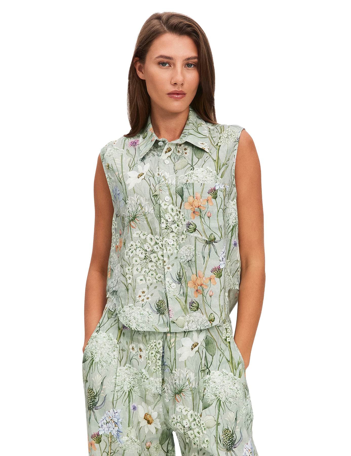 LINEN Блуза женская без рукавов, цвет шалфей, паттерн wild flowers