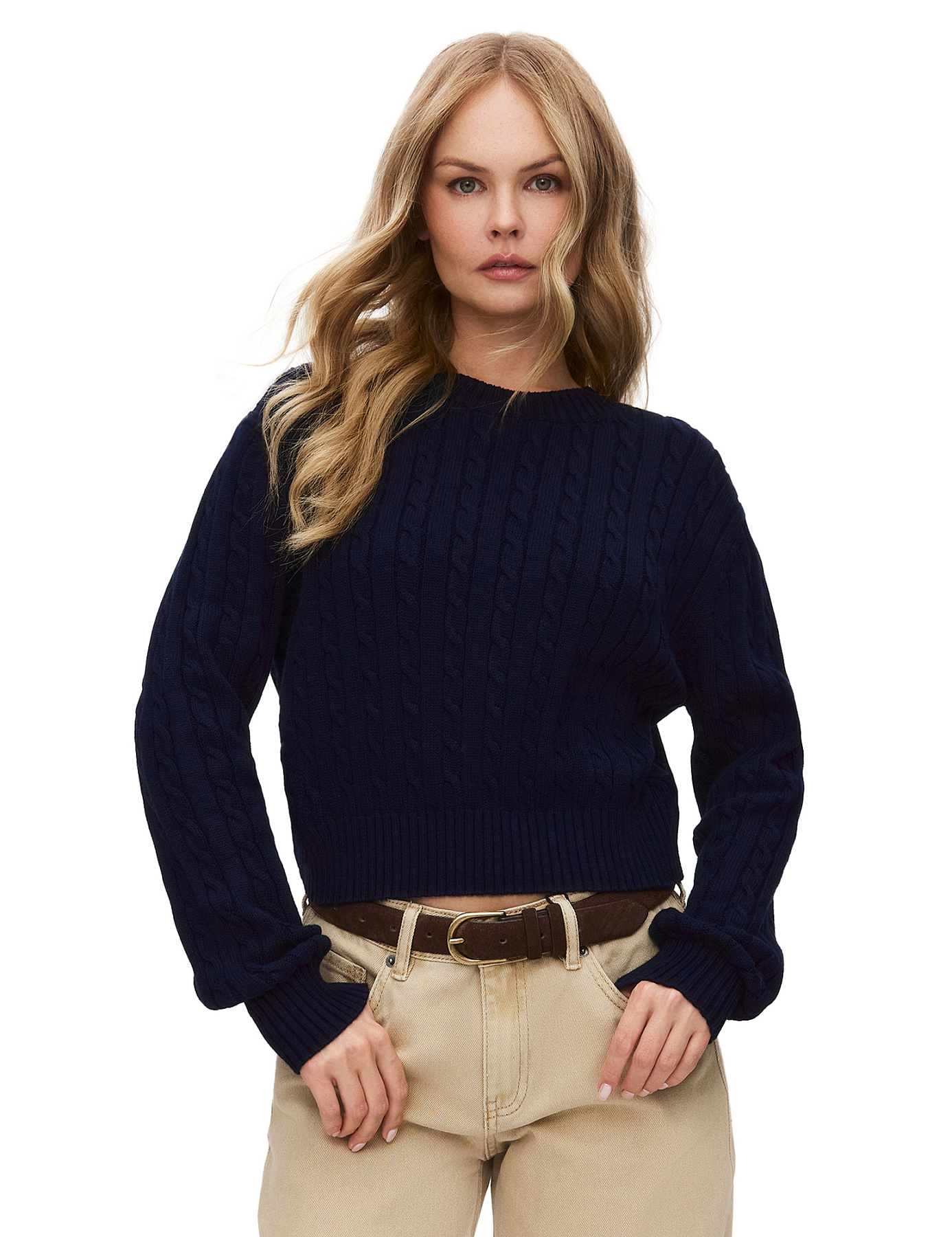 Джемпер с орнаментом "косы" укороченный, цвет темно-синий