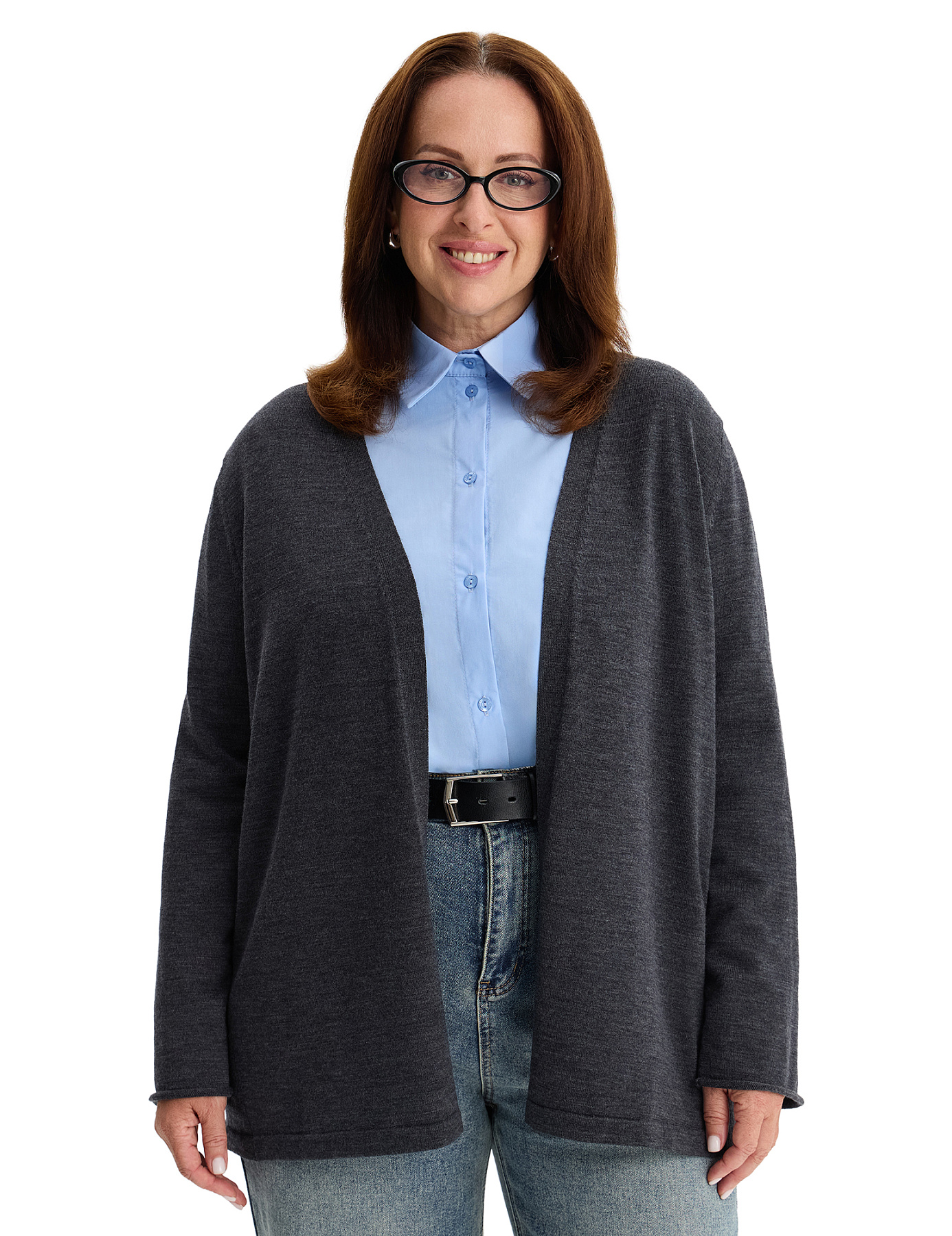 Какой же он классный, мягкий, нежный, сидит прекрасно. Находка для меня,купила с топом в паре, в черном цвете - идеально! На работу, в выходные, куда угодно. Чудо, а не кардиган. Хочу еще бежевый))