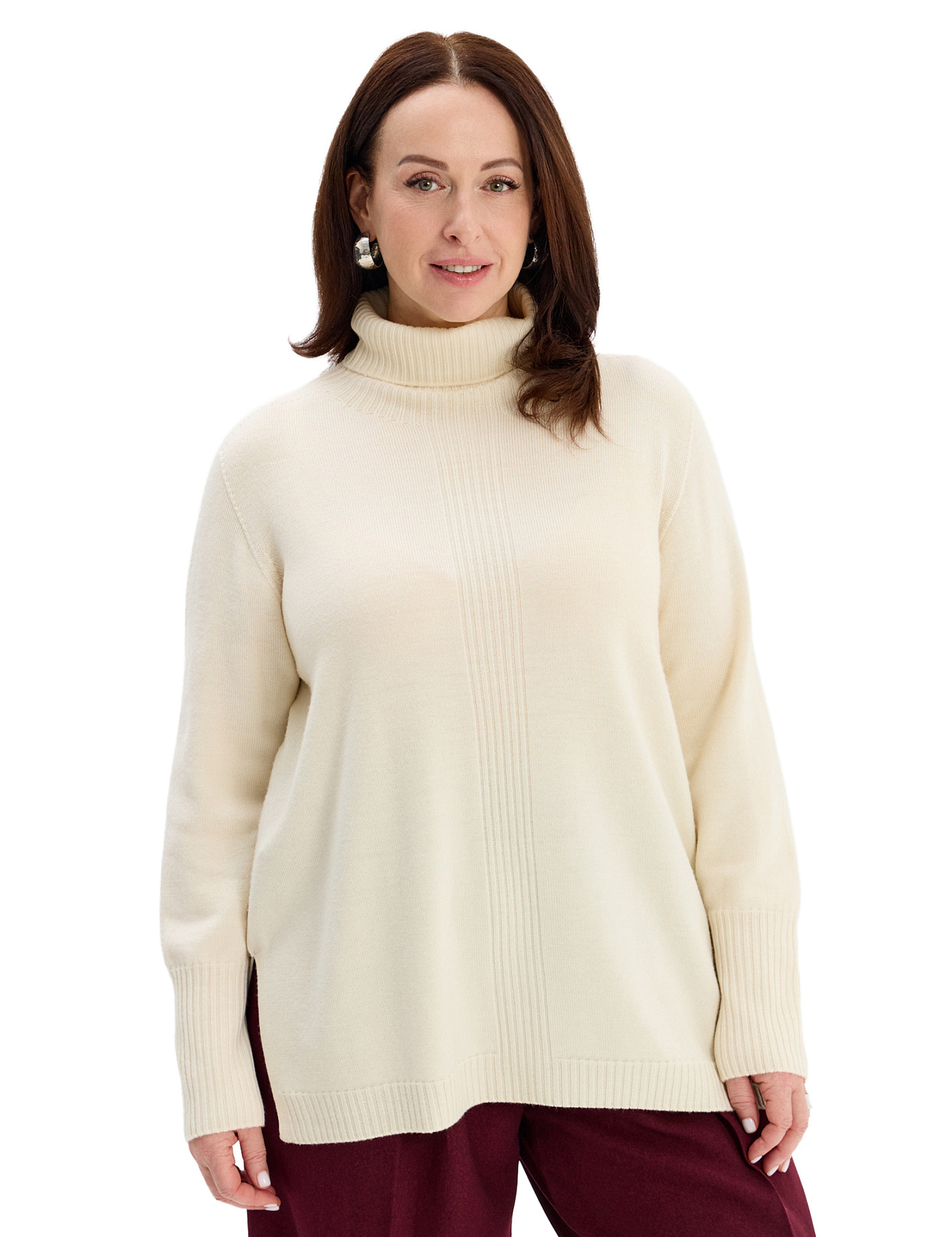Обновите свой гардероб этим элегантным женским свитером с высоким воротником. Свободный крой и продуманные детали делают его особенным. Воротник с отворотом регулируется по высоте, а скошенные плечи визуально корректируют фигуру. Манжеты и низ в рубчик добавляют текстуру и позволяют варьировать посадку. Орнамент, расположенный по центру изделия спереди и сзади, выгодно выделяет силуэт.